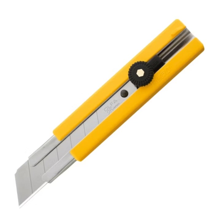 Nóż segmentowy OLFA H1- to solidny nóż z szerokim ostrzem 25 mm, który sprawdzi się w warsztacie kaletniczym wszędzie tam, gdzie potrzebne jest szybkie i pewne cięcie grubych materiałów. Bez trudu radzi sobie z cięciem grubej skóry, filcu, gumy, pasów nośnych, tektury czy kilku warstw materiału jednocześnie.
